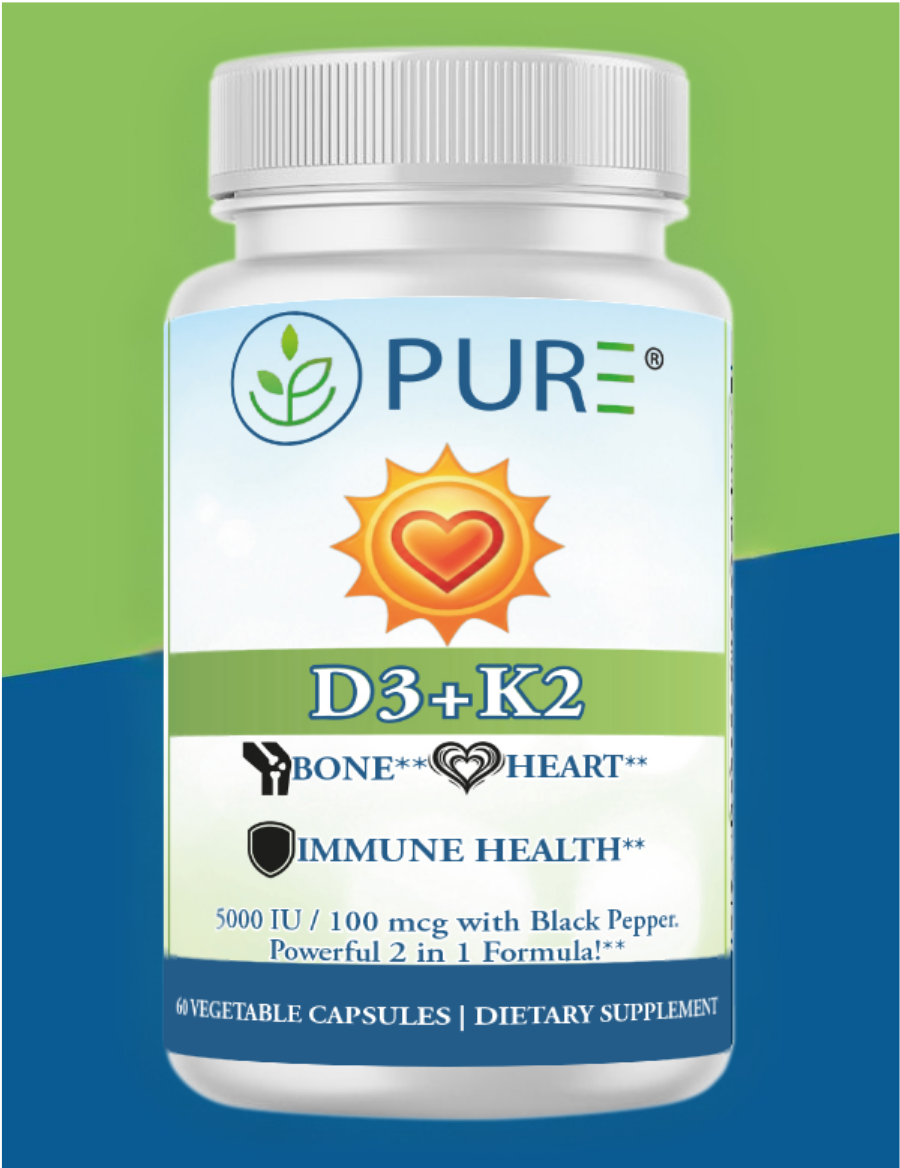 Boost your health with PURE® D3 + K2, a potent blend of 5000 IU Vitamin D3, 100 mcg Vitamin K2, and 25 mg black pepper extract for maximum absorption!*