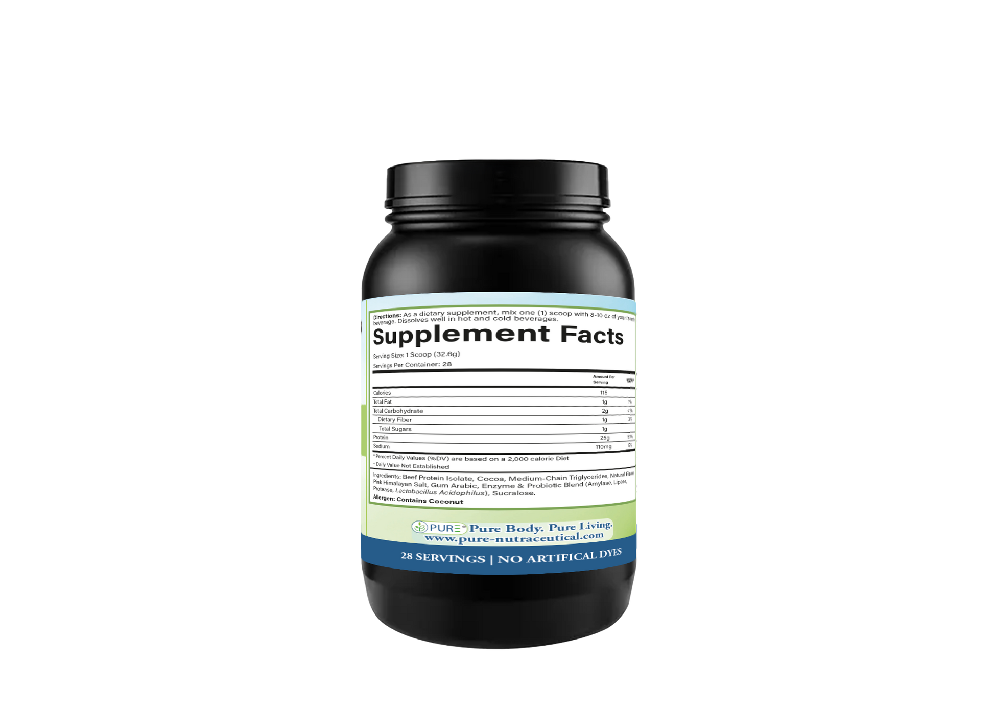 Say goodbye to regular dairy-based whey and hello to premium beef protein power with PURE® Beef Protein Isolate! A dairy-free supplement sourced from pasture-raised cows, delivering 25g of high-quality beef protein per scoop in a 28 serving container. Enhanced with MCT oil for creamy texture and healthy fats that provide quick energy and weight management support, plus natural collagen peptides, enzymes, and probiotics. This superior formula leverages grass-fed beef for muscle growth and strength comparable to whey while boosting joint, skin, and gut health with unique amino acids like glycine and proline. It also aids digestion and enhances recovery without whey’s lactose or allergens. PURE® Beef Protein Isolate is perfect for athletes, paleo/keto followers, or anyone seeking peak performance and vibrant health.* Available in Two Tasty Flavors: Vanilla and Chocolate!